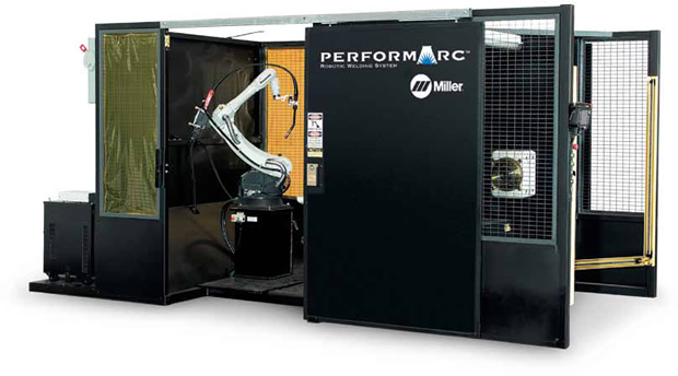 Small footprint. Great first cell for a customer new to robotics, or just an addition to your fleet. Entry level, so lowest starting price of all Performarcs. All on 1 welded frame; just drop it in with a forklift, add air and power, and you are ready to go. Typical part sizes (in inches): 12 x 53, 18 x 45, 24 x 30 |
